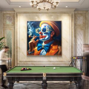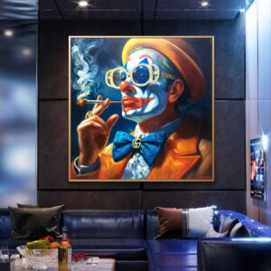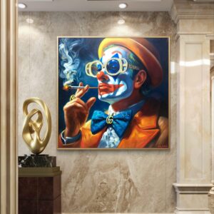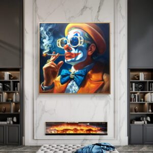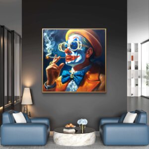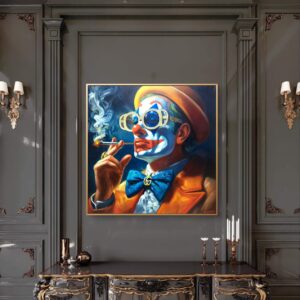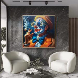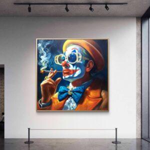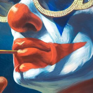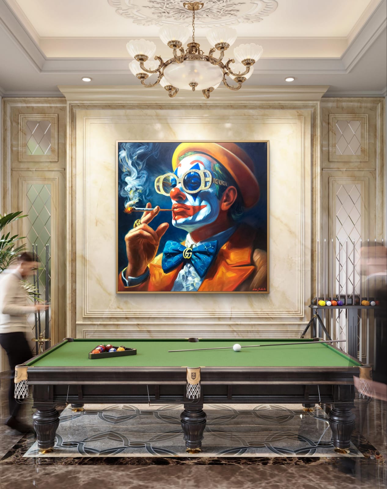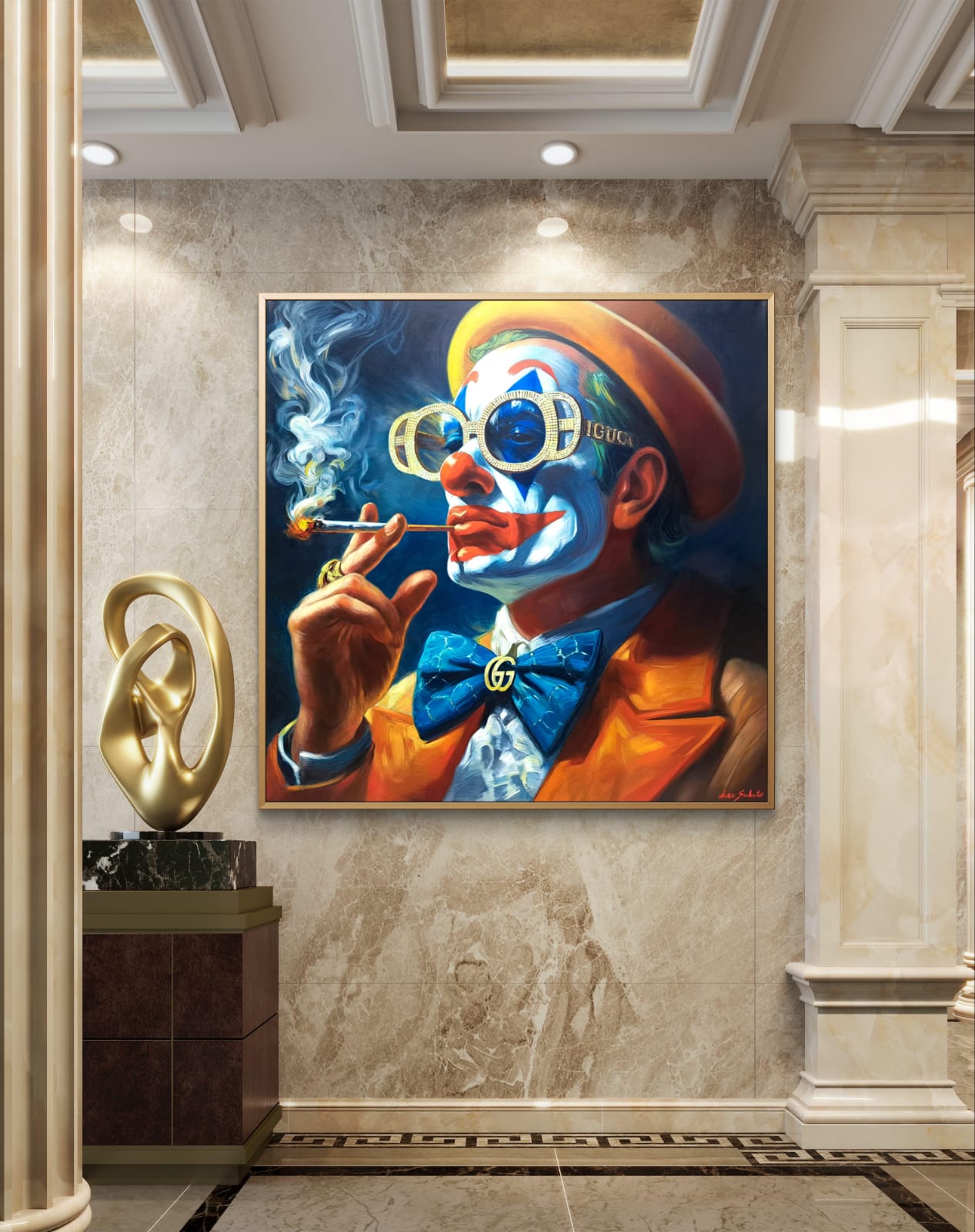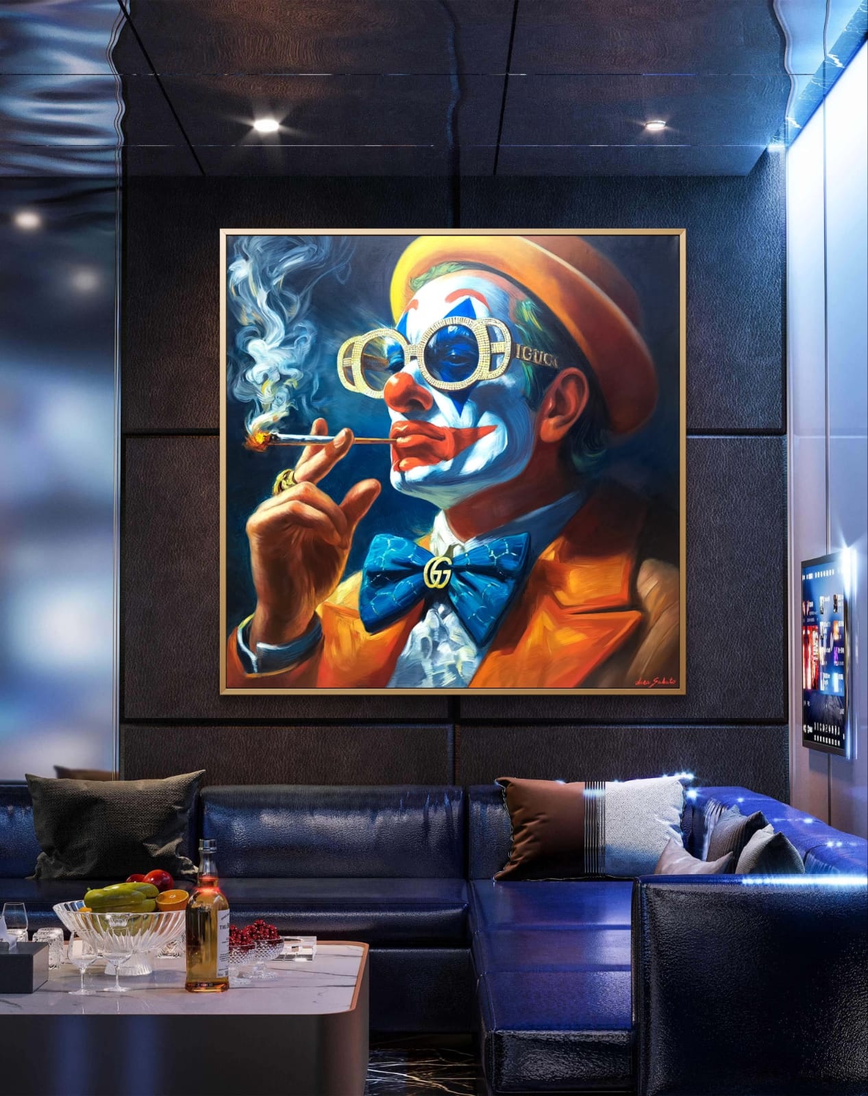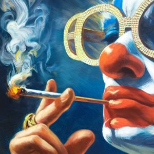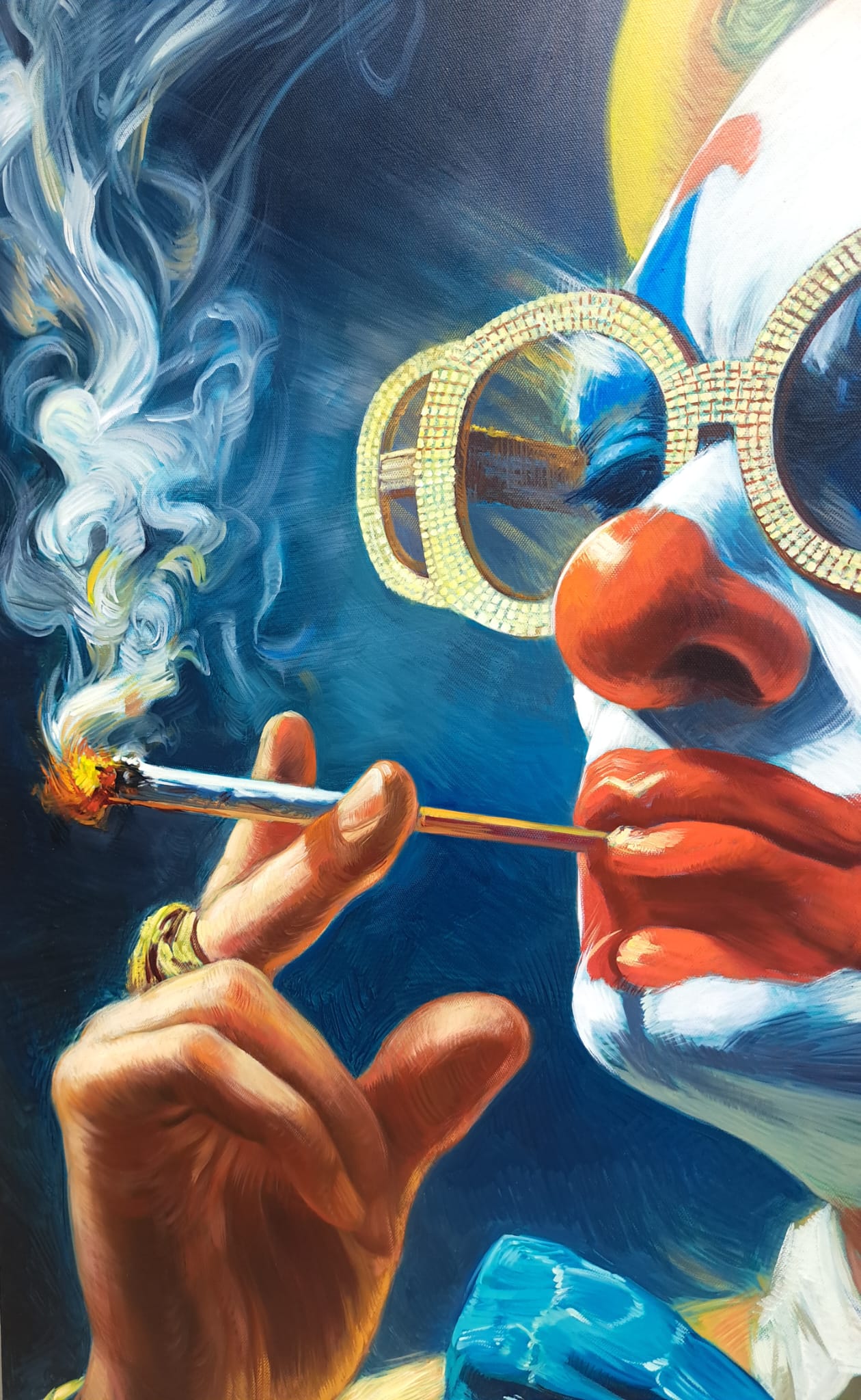 In questa tela, ho scelto di reinventare l’iconografia classica del Clown, figura che tradizionalmente incarna gioia e malinconia autentica, rivestendola di simboli del lusso contemporaneo. Il trucco iconico sul volto, che dovrebbe evocare un’emozione pura, viene immediatamente filtrato e amplificato da un paio di sfolgoranti occhiali da sole Gucci tempestati di strass, affiancati da un altrettanto vistoso papillon blu Gucci. Il cappello a falda larga e il gesto di fumare una sigaretta completano l’immagine di una sofisticazione beffarda.