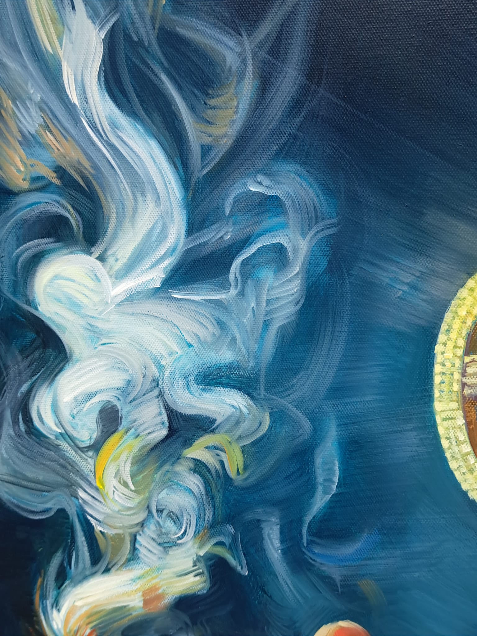 Ho voluto creare una critica visuale: questi accessori di lusso non sono semplici abbellimenti, ma diventano metafore della “maschera” che la società impone, e che noi stessi indossiamo, per definire il nostro status. Il fumo che si disperde nell’aria è un richiamo alla “Vanitas”, un memento mori moderno che suggerisce la caducità non solo della vita, ma anche delle mode e del valore effimero che attribuiamo ai beni materiali.