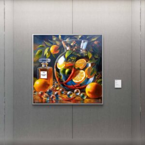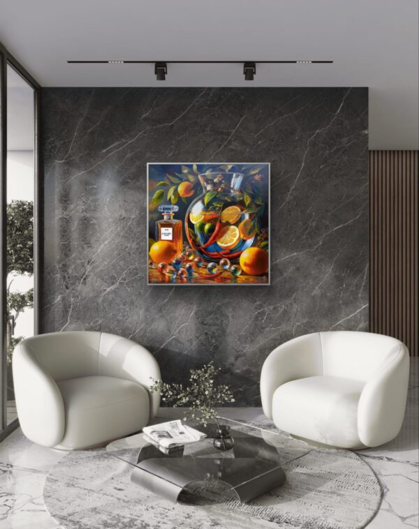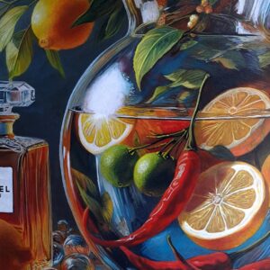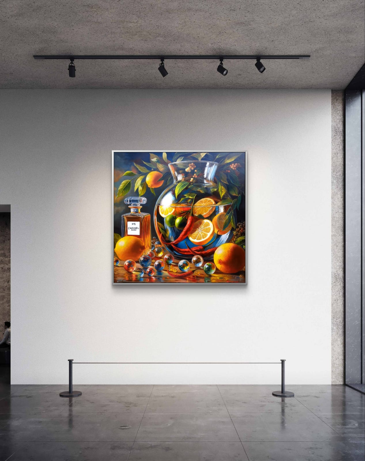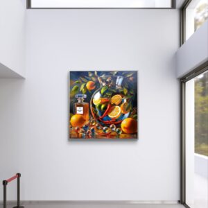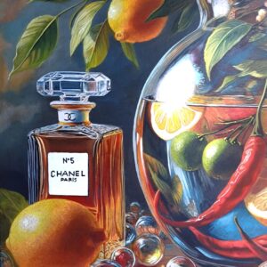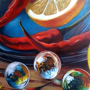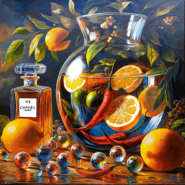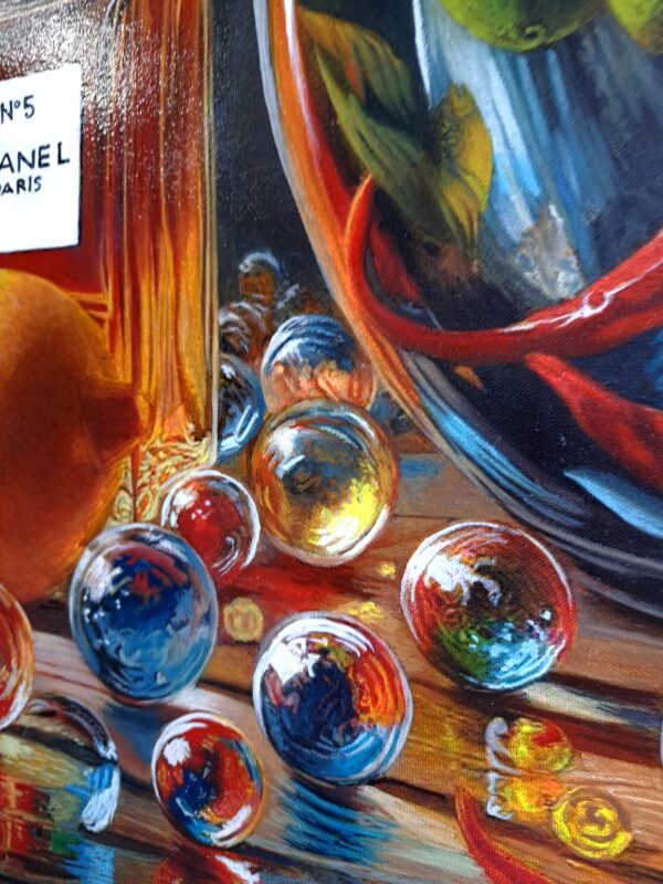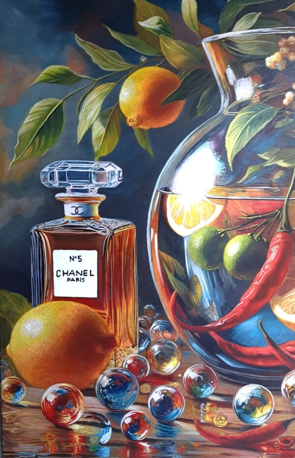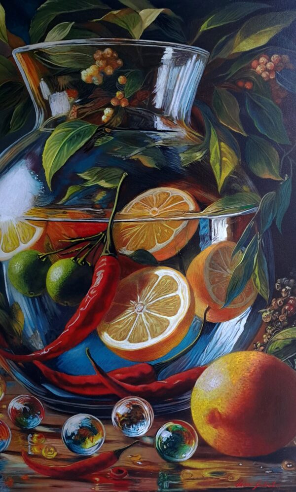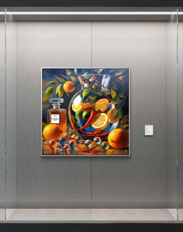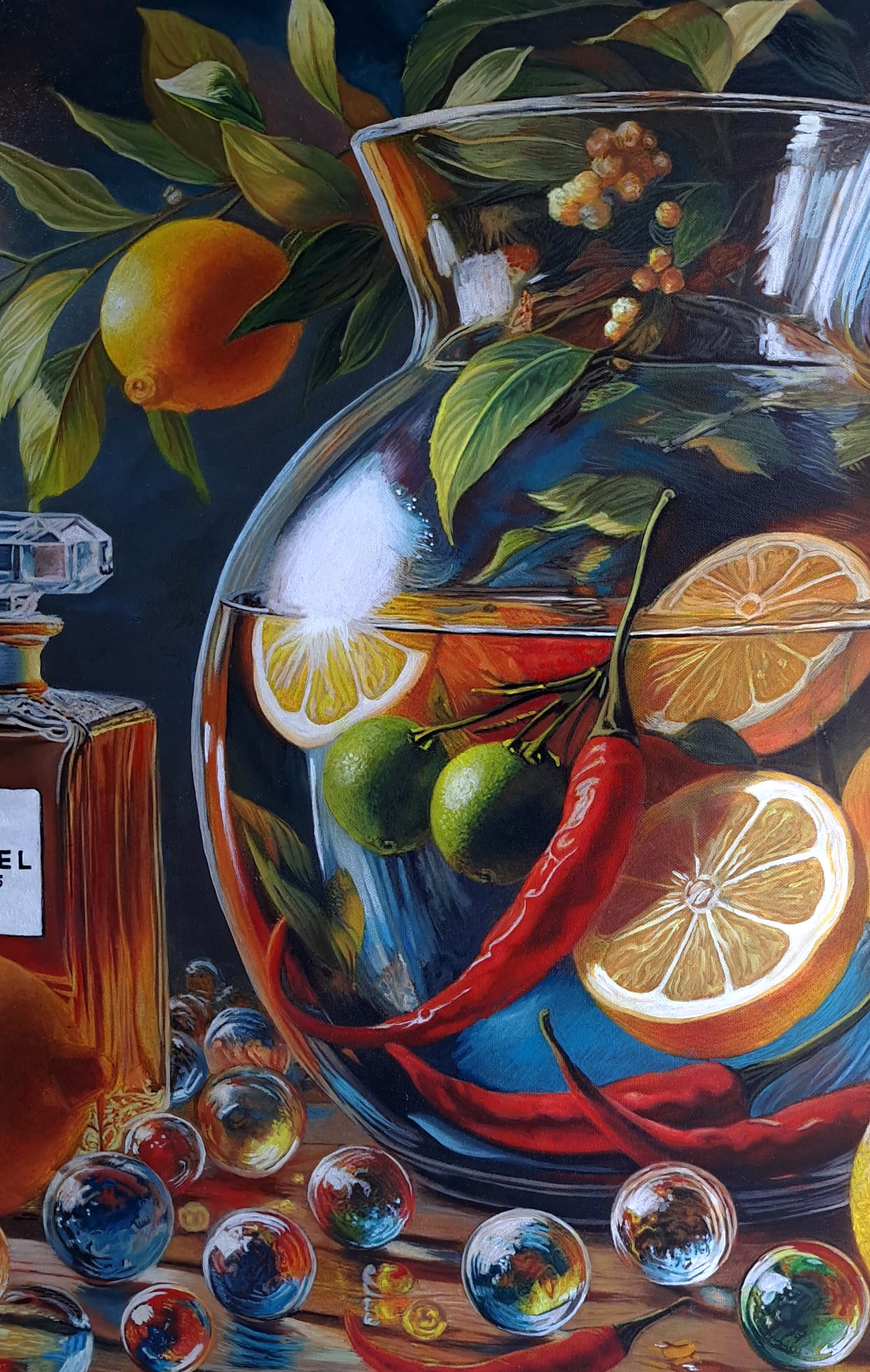 Questa tela riflette una tensione tra natura e artificio, tra semplicità e lusso. Con “Vibrazioni di vetro e colore”, voglio esplorare il modo in cui piccoli frammenti della nostra quotidianità un vaso, un profumo, agrumi e biglie possono raccontare una storia più grande. È un invito a riflettere su come gli oggetti che ci circondano, anche quelli più comuni, portino con sé significati profondi e universali.