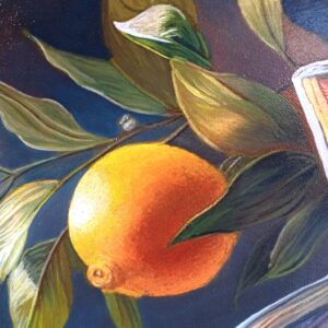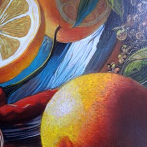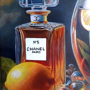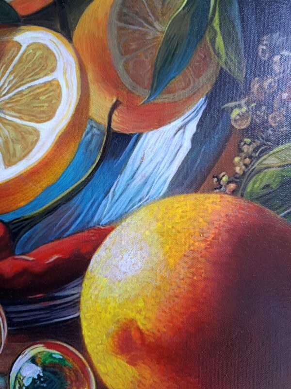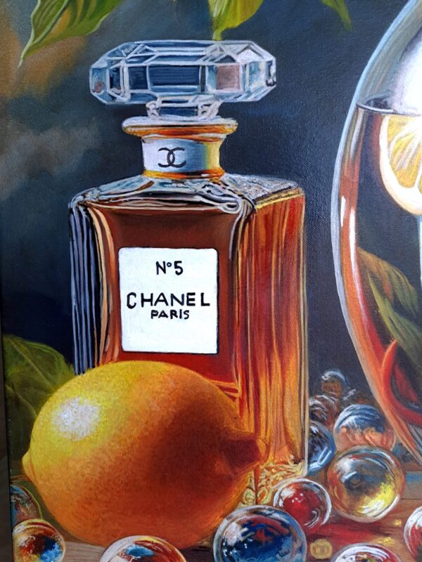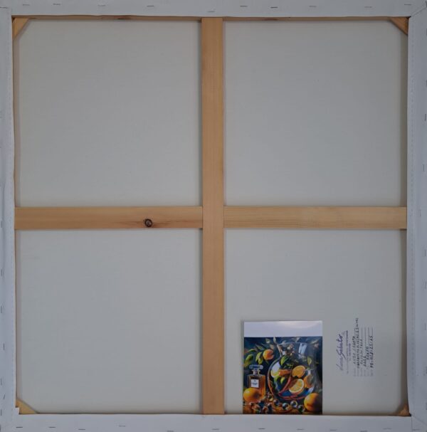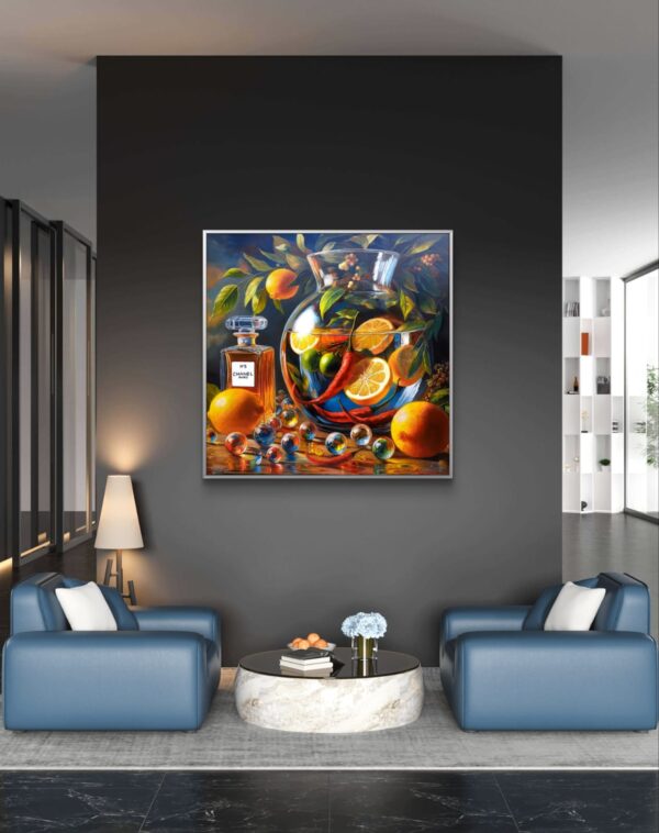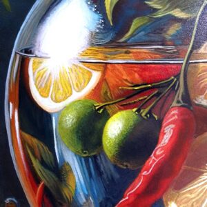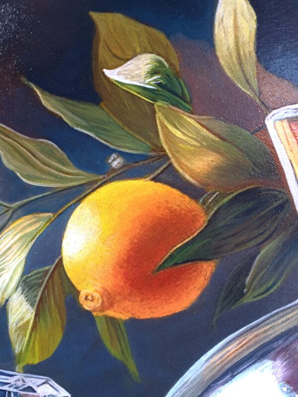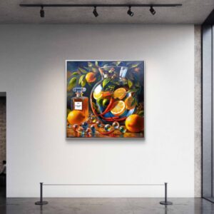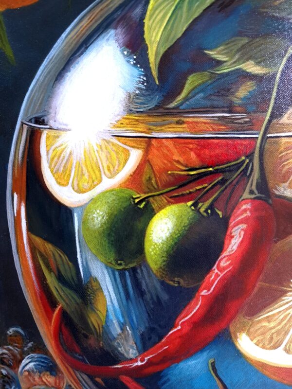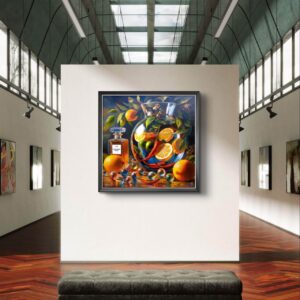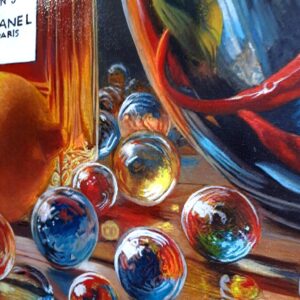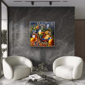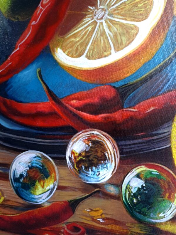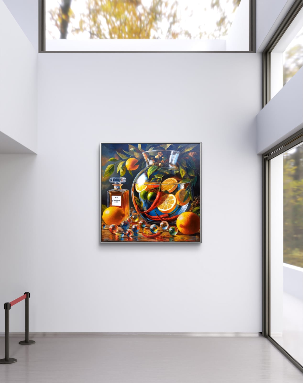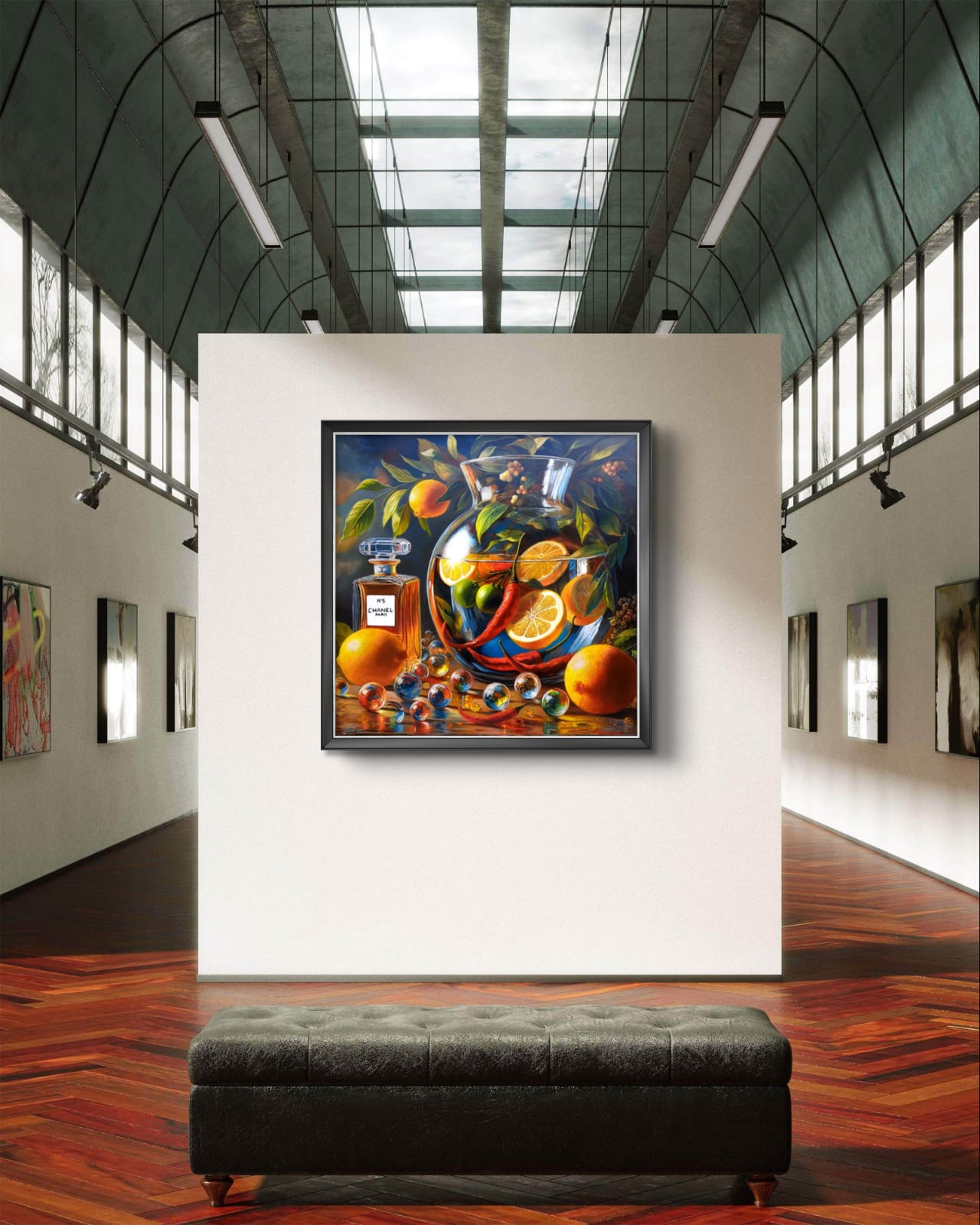 Questa tela riflette una tensione tra natura e artificio, tra semplicità e lusso. Con “Vibrazioni di vetro e colore”, voglio esplorare il modo in cui piccoli frammenti della nostra quotidianità un vaso, un profumo, agrumi e biglie possono raccontare una storia più grande. È un invito a riflettere su come gli oggetti che ci circondano, anche quelli più comuni, portino con sé significati profondi e universali.