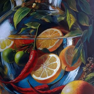 Al centro della scena, un vaso in vetro trasparente contiene acqua e ospita fette di limone, lime e peperoncini rossi. Ho scelto questi elementi per la loro vivacità e forza simbolica: gli agrumi evocano freschezza e vitalità, mentre i peperoncini rappresentano passione ed energia. L’acqua nel vaso crea riflessi che diffondono la luce, amplificando la bellezza naturale degli oggetti e dando alla scena un dinamismo unico.