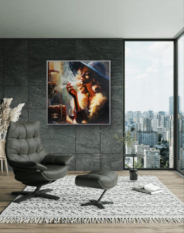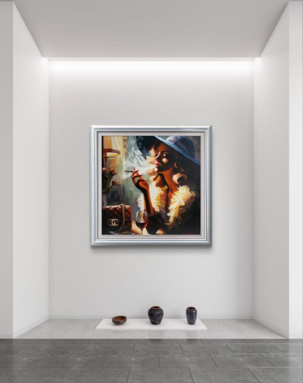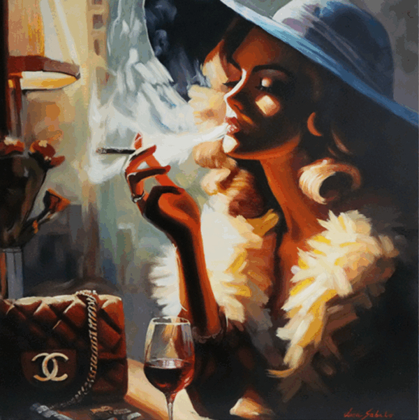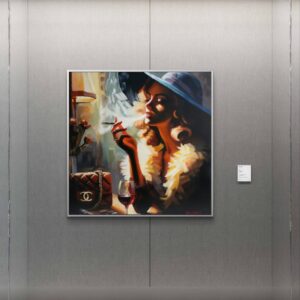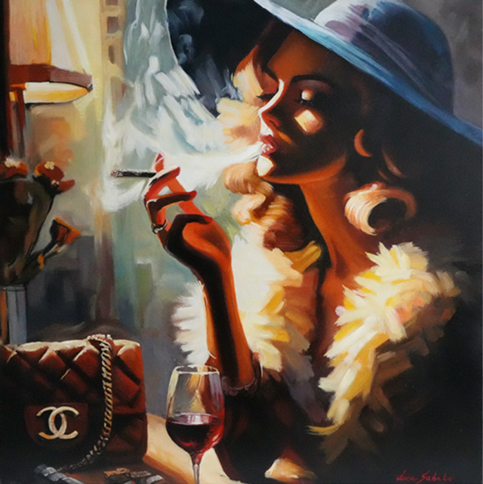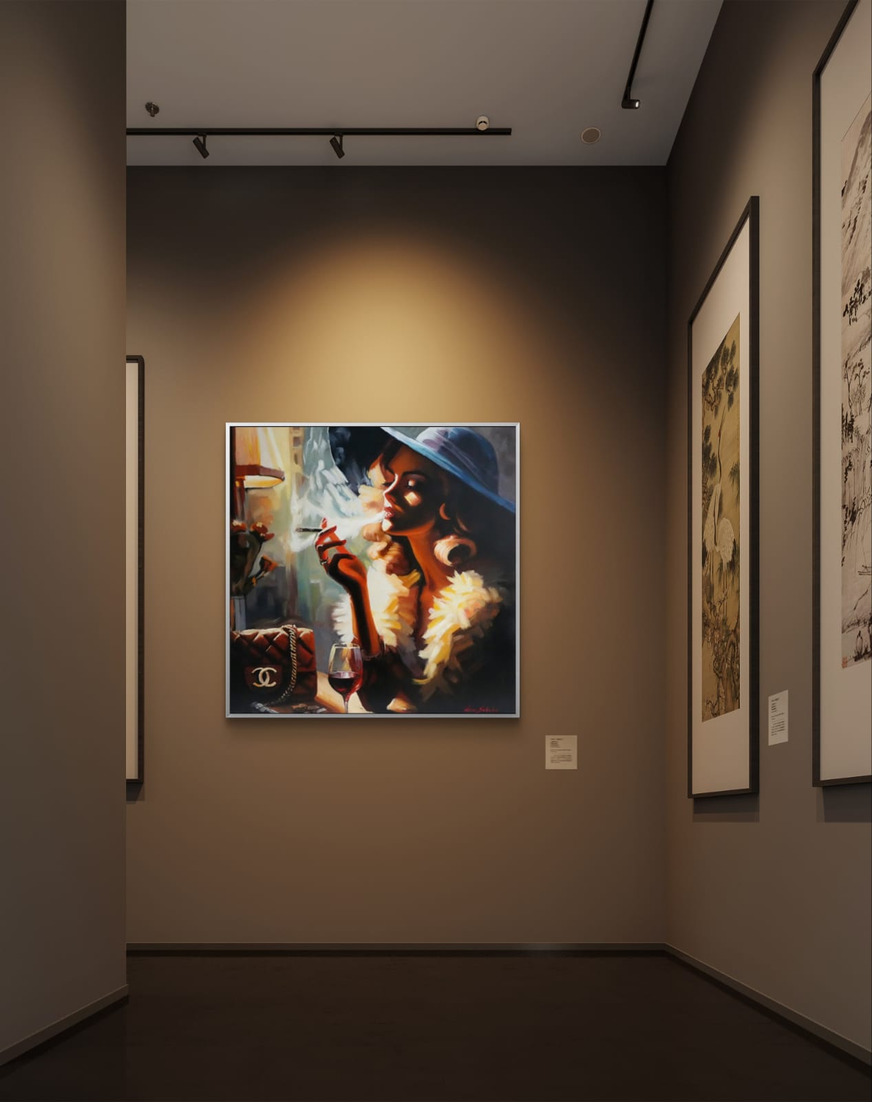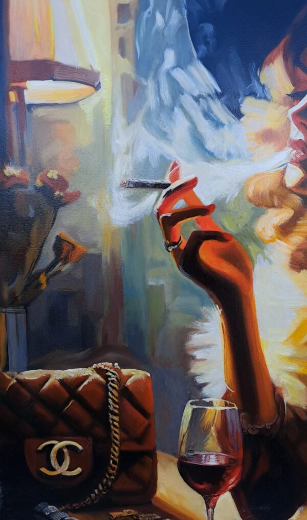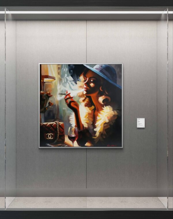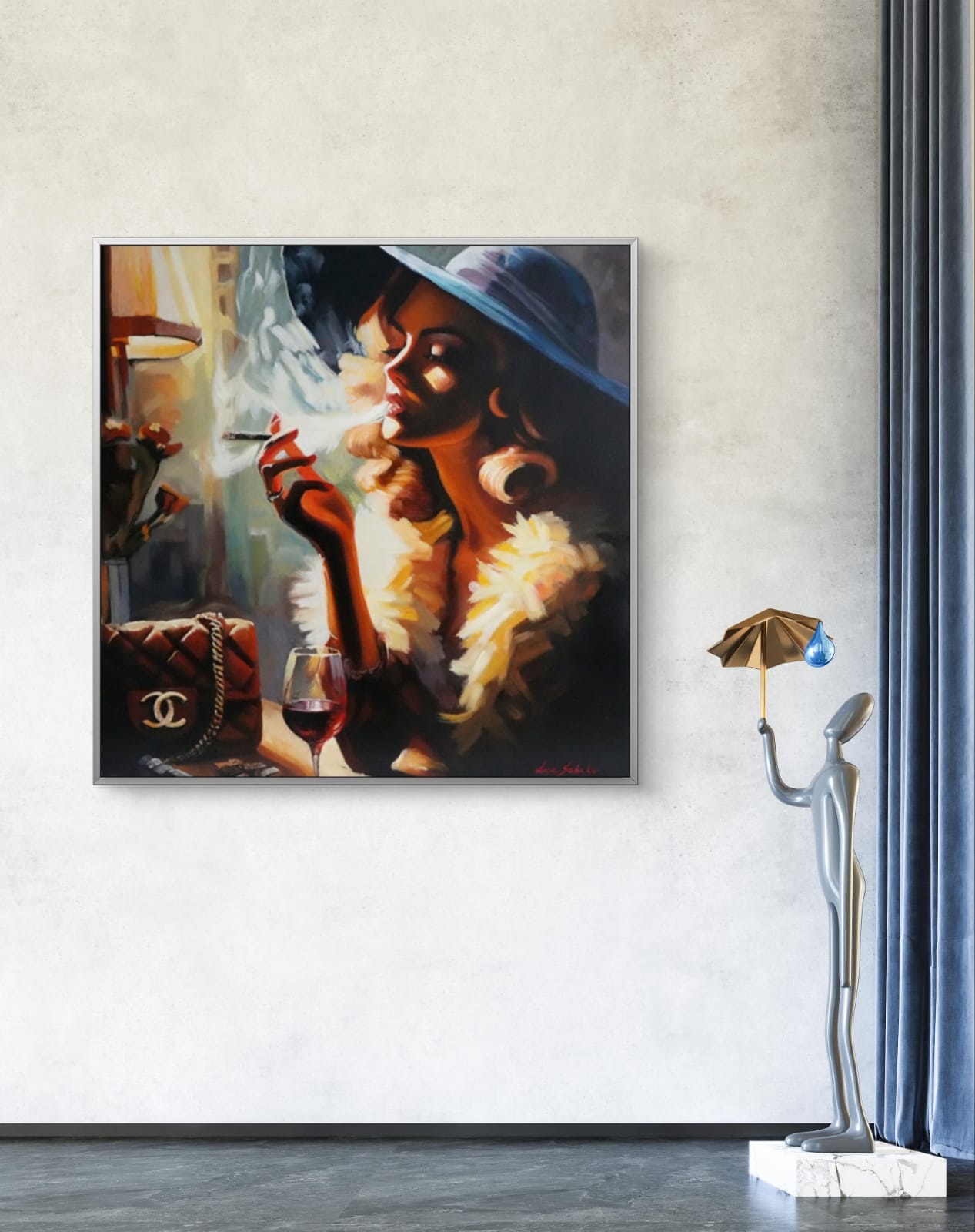 La figura centrale, questa donna enigmatica, è il fulcro dell’opera. I suoi boccoli evidenti, il cappello blu e la sciarpa di pelliccia bianca suggeriscono eleganza, ma anche una distanza, una vulnerabilità nascosta dietro il lusso. Il calice di vino rosso accanto e la borsa Chanel sul tavolo sono simboli di ciò che desideriamo e inseguiamo: oggetti di vanità che sembrano definire momenti, identità, ma che spesso nascondono il vuoto. Il gesto di fumare diventa così una metafora: una piccola azione che si consuma e svanisce, proprio come tanti piaceri e scelte nella nostra vita.