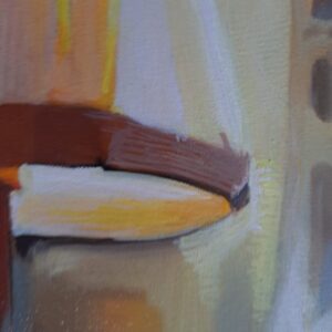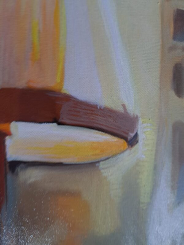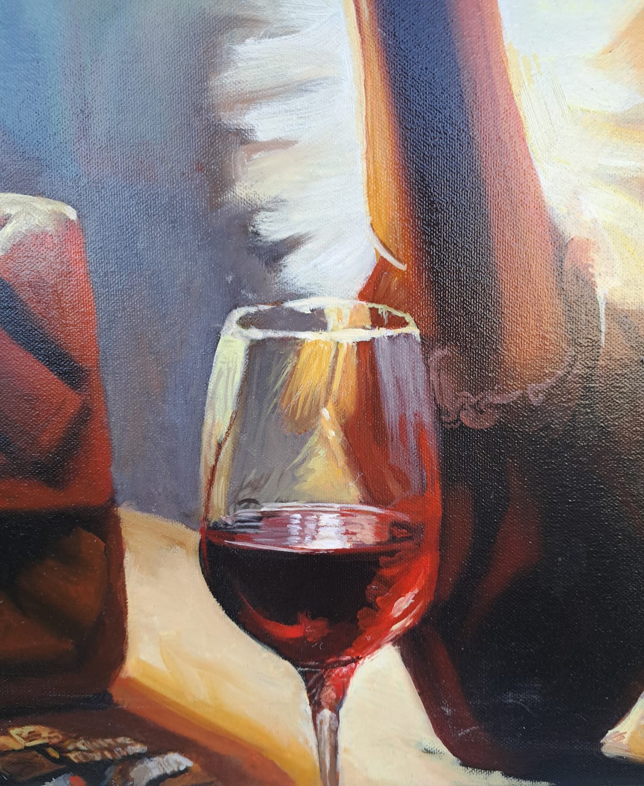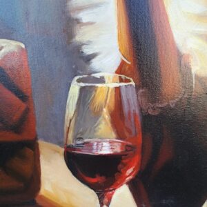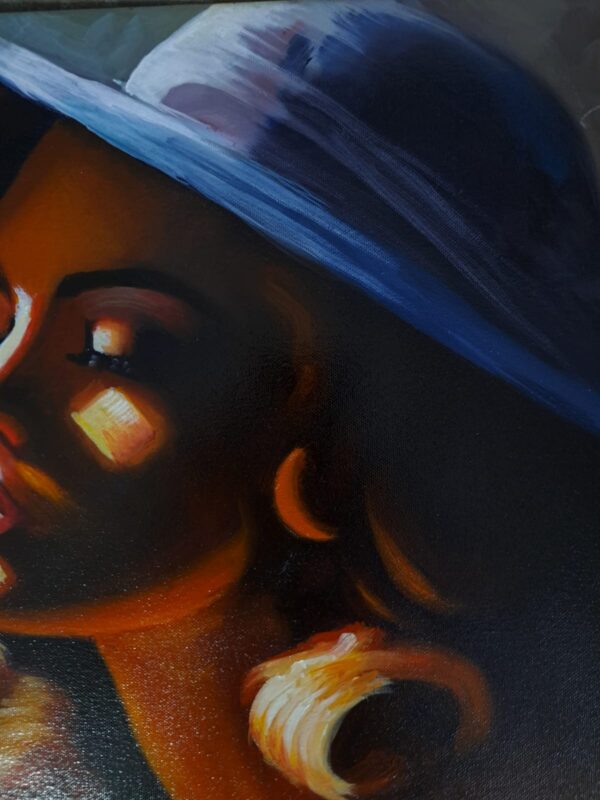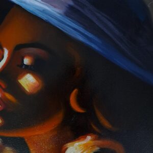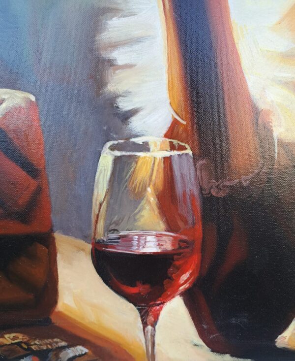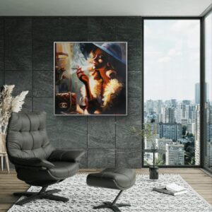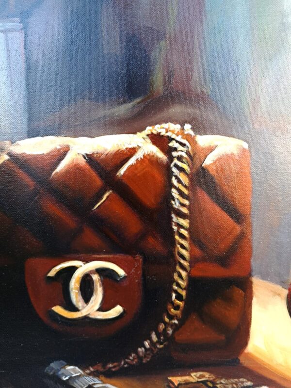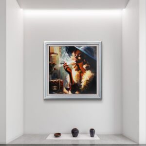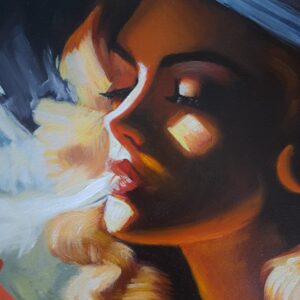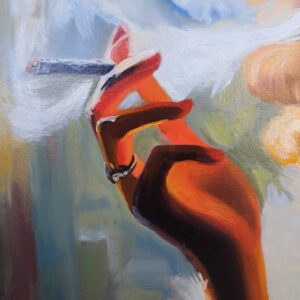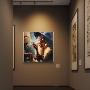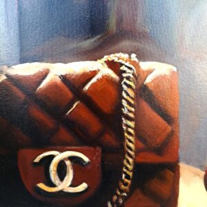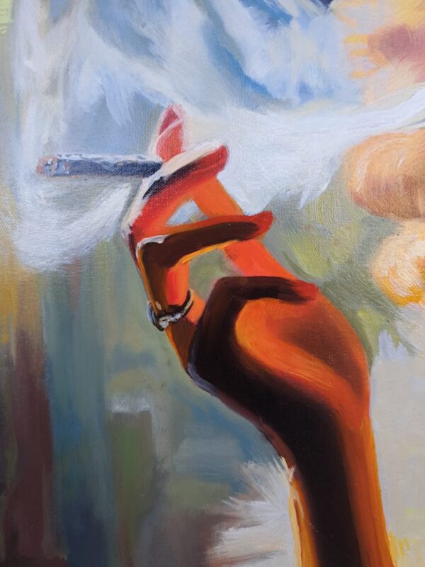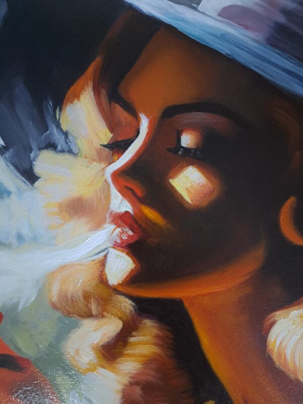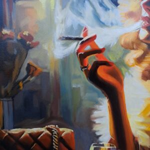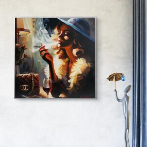 La figura centrale, questa donna enigmatica, è il fulcro dell’opera. I suoi boccoli evidenti, il cappello blu e la sciarpa di pelliccia bianca suggeriscono eleganza, ma anche una distanza, una vulnerabilità nascosta dietro il lusso. Il calice di vino rosso accanto e la borsa Chanel sul tavolo sono simboli di ciò che desideriamo e inseguiamo: oggetti di vanità che sembrano definire momenti, identità, ma che spesso nascondono il vuoto. Il gesto di fumare diventa così una metafora: una piccola azione che si consuma e svanisce, proprio come tanti piaceri e scelte nella nostra vita.